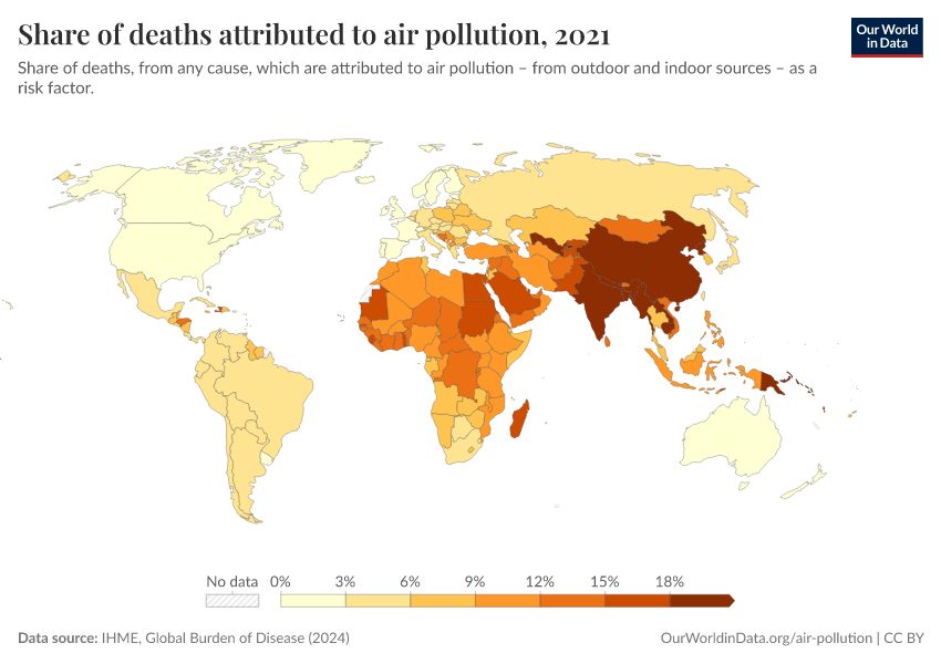 In the map shown here, we see the share of deaths attributed to air pollution across the world.