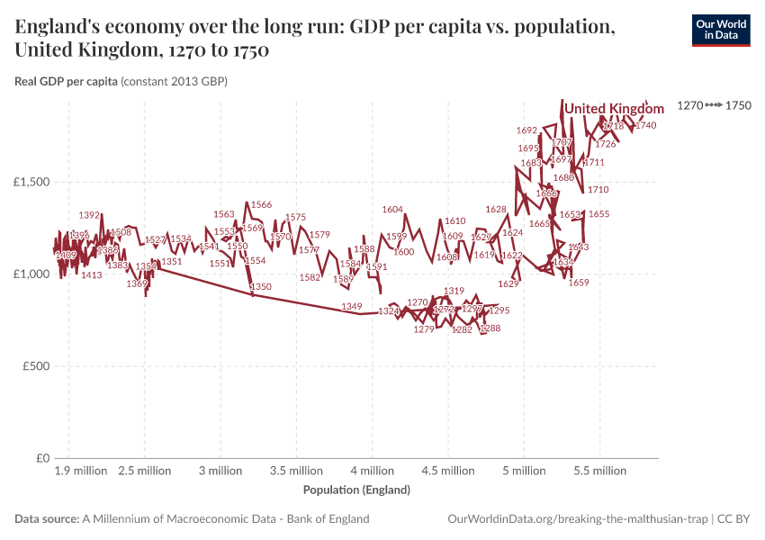 Max Roser (2020) - “Breaking out of the Malthusian trap: How pandemics allow us to understand why our ancestors were stuck in poverty” Published online at OurWorldinData.org. Retrieved from: 'https://archive.ourworldindata.org/20251125-173858/breaking-the-malthusian-trap.html' [Online Resource] (archived on November 25, 2025).BibTeX citation