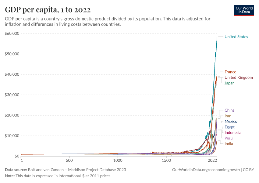 Reconstructions of living conditions over the long-run suggest that when Malthus wrote these words in 1789, he was right about the past. As the visualization here shows, GDP per capita — the average income of people — had remained extremely low.