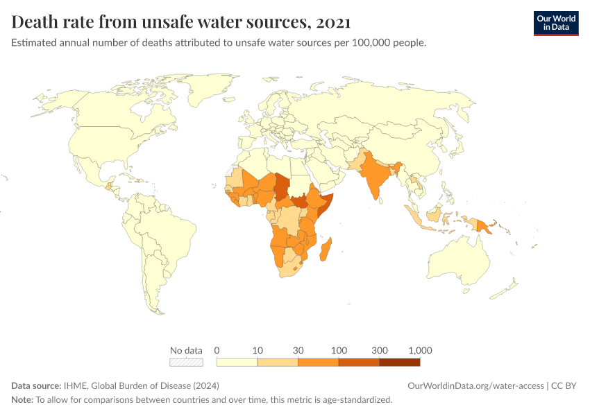 This map shows the death rates from unsafe water sources worldwide. Death rates measure the number of deaths per 100,000 people in a given country or region.