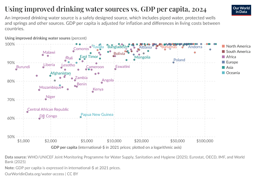 The visualization shows the relationship between improved water source usage and gross domestic product (GDP) per capita. We see a general link between income and improved water source usage.