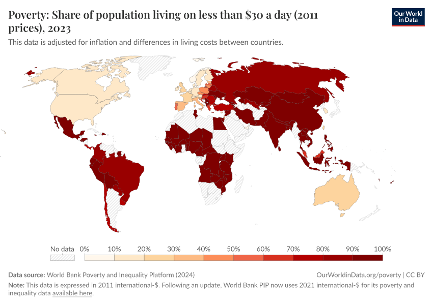 In the map below, and in all international poverty statistics on Our World in Data, the data is adjusted for inflation and cross-country differences in the price level. The expandable section below the map provides a more detailed explanation of how.
