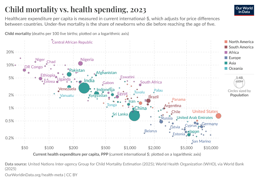 The chart below shows how healthcare spending is related to child mortality, in the same format.