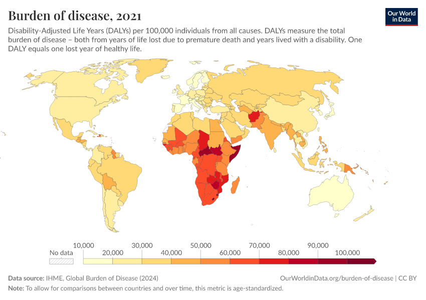 This map shows DALYs per 100,000 people in the population. It is thereby measuring the distribution of the burden of both mortality and morbidity around the world.