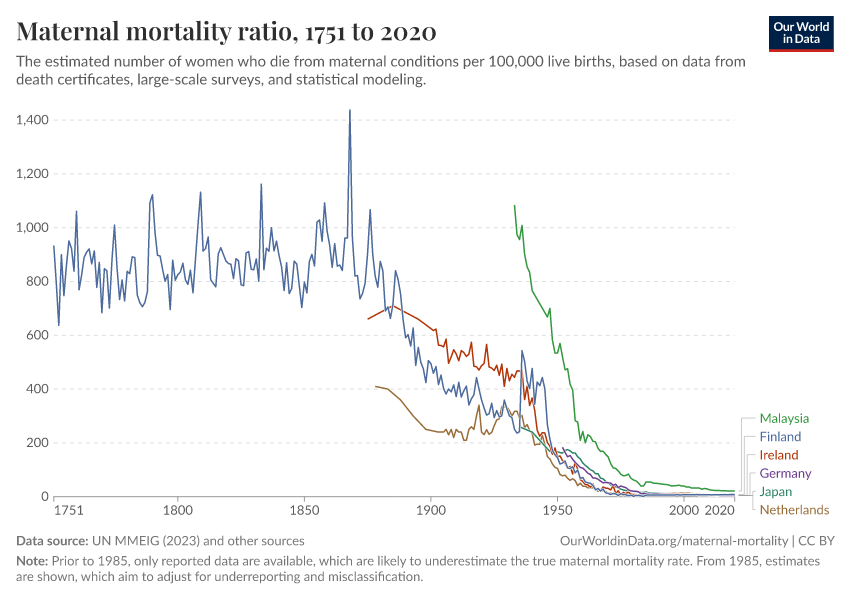 Historical data on maternal mortality, particularly from high-income countries, shows significant reductions over time.
