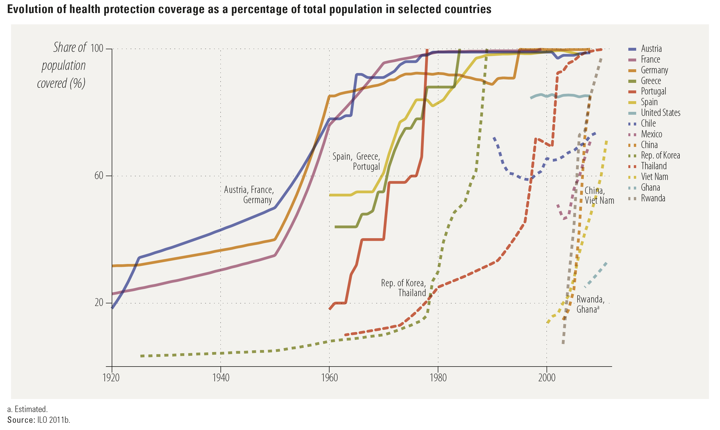 The source given for the data corresponds to Figure 1 in ILO, (2011), Social Protection Floor for a Fair and Inclusive Globalization. Report of the Advisory Group chaired by Michelle Bachelet convened by the ILO with the collaboration of the WHO. Geneva: International Labour Office. Available online here.