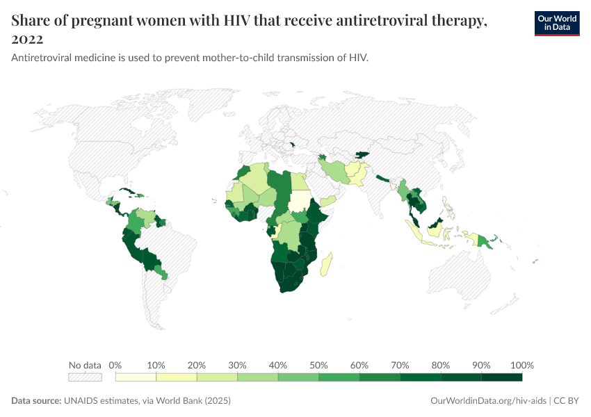 This map shows the share of pregnant women infected with HIV who receive antiretroviral therapy – a vital intervention to prevent the transmission from mother to child.