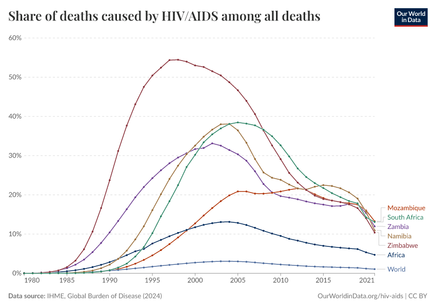 In the visualization, we see the change in the share of deaths from HIV/AIDS over time. From the 1990s through to the early 2000s, it was the cause of more than 1 in 3 deaths in several countries and even more than half of annual deaths in the late 1990s in Zimbabwe.