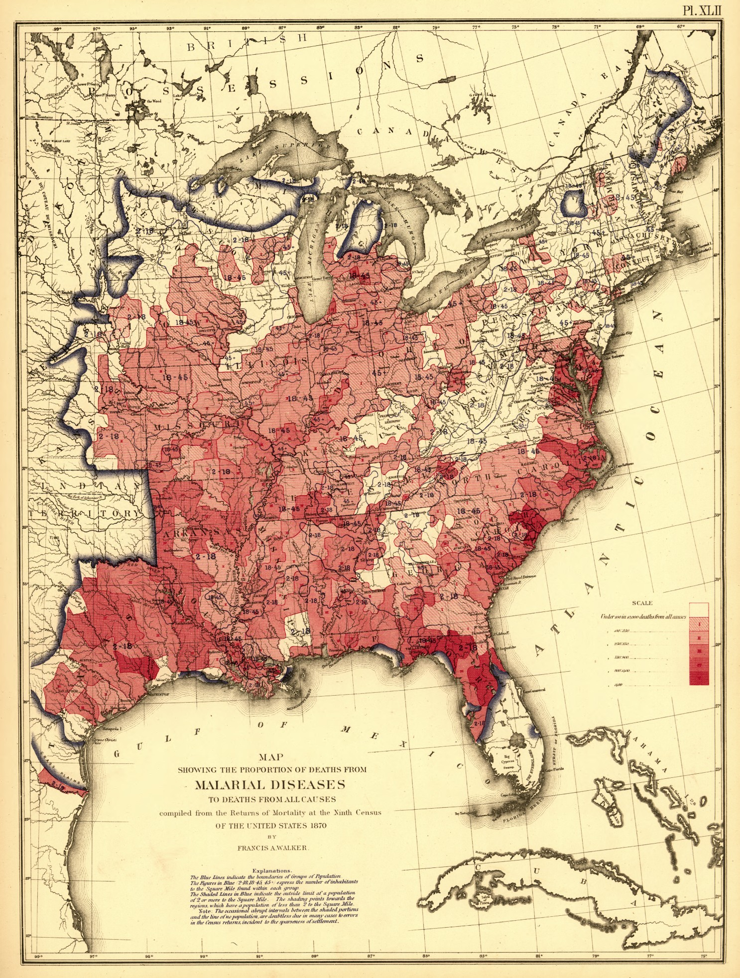 The map is taken from the US census from 1870. It shows in detail what the previous section discussed. Shown is the share of all deaths caused by malaria in the American Southeast at that time.
