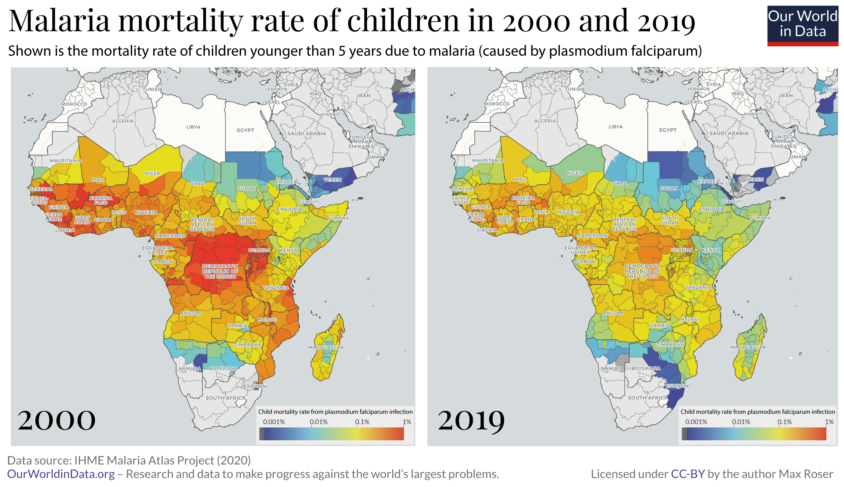 The years since the turn of the millennium were an extraordinarily successful era in the fight against malaria. The two maps show the change in malaria mortality for children in the region where the disease causes the highest death toll.14