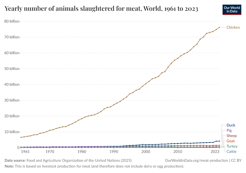 This is shown across various types of livestock. Here these figures represent the total number slaughtered for meat production (which does not include those used primarily for dairy or egg production which are not eventually used for meat).