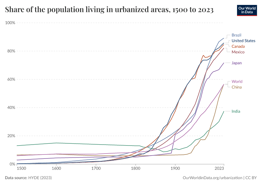 In the map below we see how the share of populations living in urban areas has changed in recent centuries. Data on urbanization dating back to 1500 is available only for select countries, with an estimated share at the global level. Using the timeline on the map (or by clicking on a country) you can see how this share has changed over time.