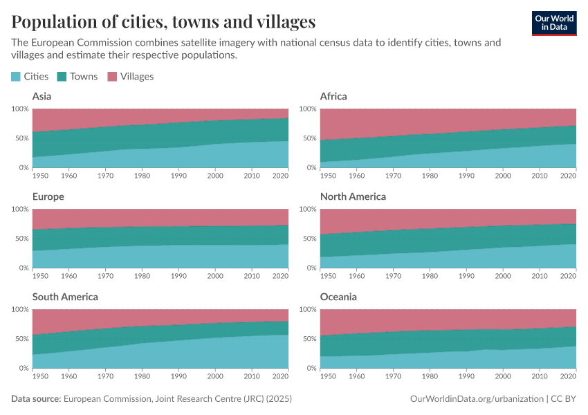 However, the manual on how to apply the Degree of Urbanization recommends reporting figures across three distinct categories—cities, towns, and villages—rather than using a simple urban-rural dichotomy. This approach recognizes urbanization as a continuum, acknowledging that towns occupy a unique position, differing significantly from both cities and villages in their characteristics and needs. The reported cities, and towns population shares by continent are shown in the chart below.