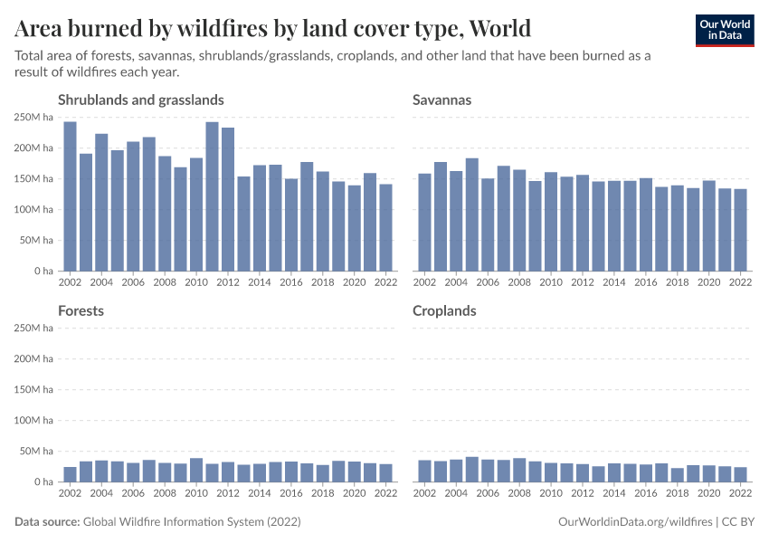 This can vary a lot depending on a country’s landscape. Savannas, for example, are much more dominant in Africa and South America America. In Oceania, it’s shrubs and grasslands. In Europe and North America, large areas of croplands are often burned.